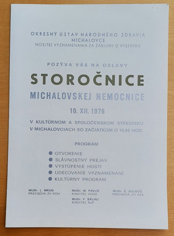 - Pozvánka na oslavy Storočnice Michalovskej nemocnice 10.XII. 1976
