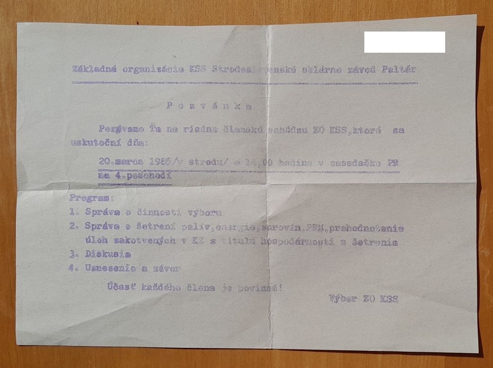 - Pozvánka na schôdzu ZO KSS - 1985